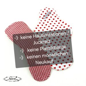 Zudem hat mich schon immer schockiert, wie viel Müll bei nur einer Einlage produziert wird – jede Einlage ist in einer Verpackung, dann noch einzeln verpackt, der Klebestreifen wird mit einem Plastikstreifen abgedeckt und nach kurzer Zeit landet alles im Müll.
